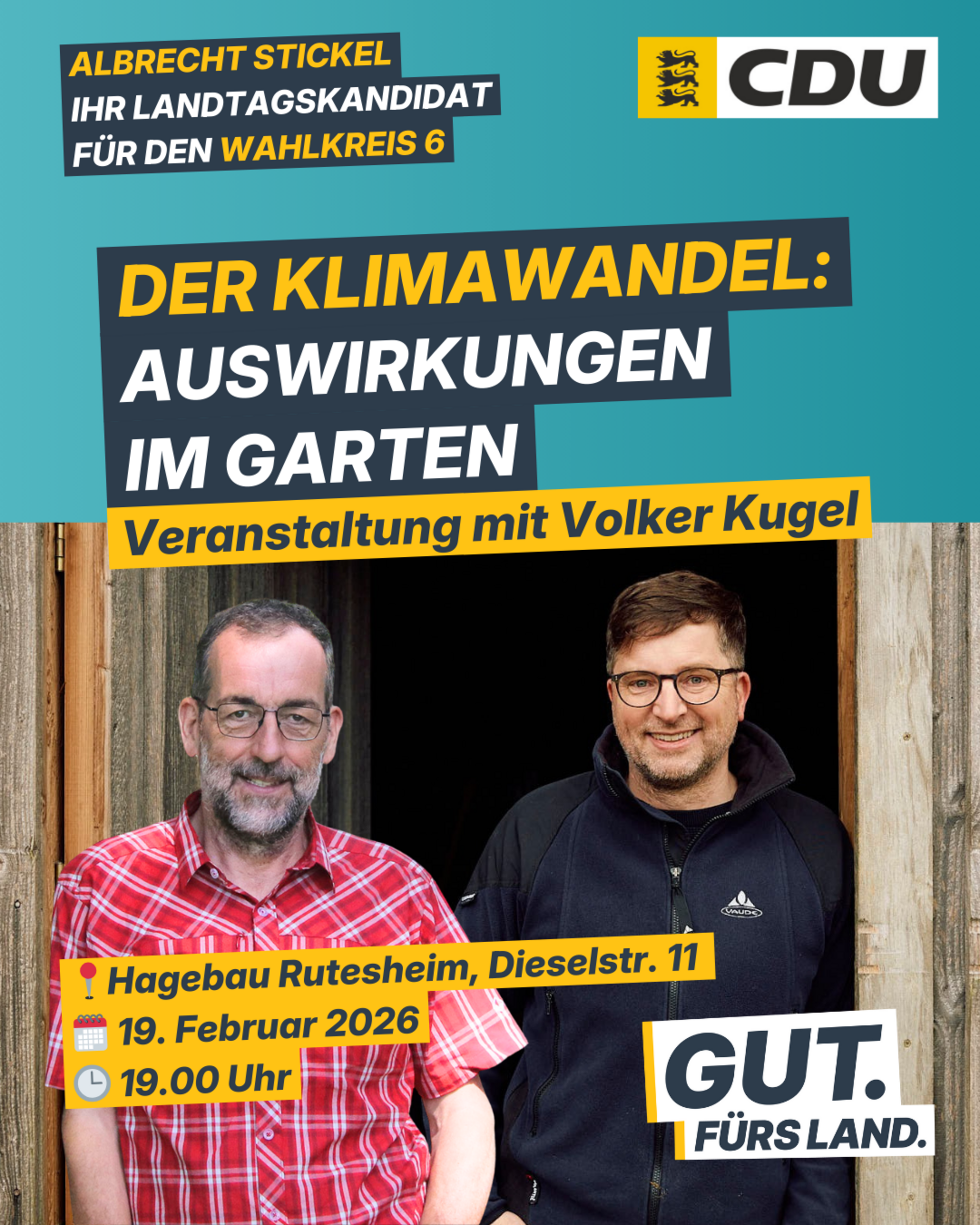 Im Anschluss an den Vortrag besteht die Möglichkeit, Fragen zu stellen und mit Volker Kugel sowie unserem Landtagskandidaten Albrecht Stickel ins Gespräch zu kommen.